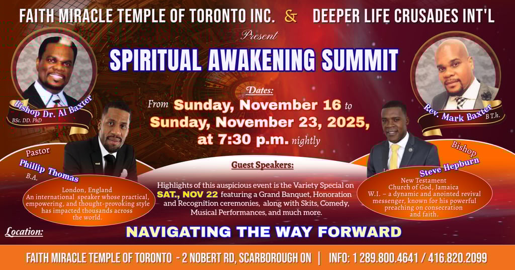 Under the leadership of Dr. Al Baxter, a globally recognized minister, author, philanthropist, and counselor, this ministry has reached countless lives across nations, including Japan, South Africa, England, the USA, and the Caribbean. As the Founder, Bishop, and CEO of the Faith Miracle Temple of Toronto, Inc., Dr. Baxter is dedicated to spreading the love of Christ and building a global community of believers.